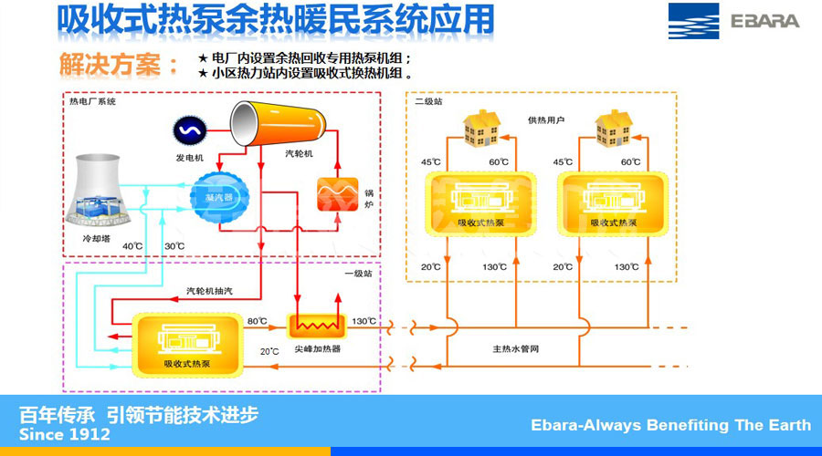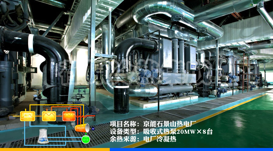 2010年,烟台荏原在京能石景山热电厂实施了热泵改造,这是吸收式热泵在大型抽凝发电机组上的**成功应用。增加供热面积200万平米,采暖季节约标煤约3.4万吨,减少SO2排放285.6吨/年,减少水损失约21.6万吨。运行稳定,节能、减排效果显著,拉开了国内大型热电厂热泵供暖改造的序幕。