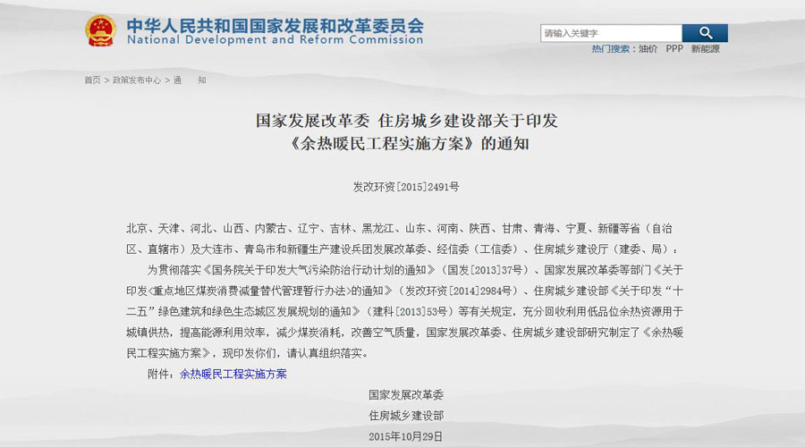 2015年10月29日,国家发展改革委、住房城乡建设部正式发布《余热暖民工程实施方案》,此举意将充分回收利用低品位余热资源用于城镇供热,提高能源利用效率,减少煤炭消耗,改善空气质量真正落到实处。