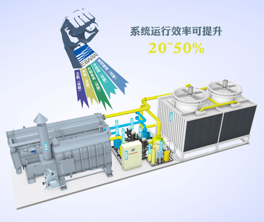 “荏原一体化冷热集成系统由制冷(热)机组、冷却塔、泵组、定压补水装置、软化水装置、智能集控系统等通过模块化设计集成为一个整体,使空调冷热源系统更加紧凑。无需机房,设备可放置在楼顶,为客户减少设计、采购、安装、管理等环节。通过优化系统、合理布局、撬块化组合,占地面积可节省50%以上。”