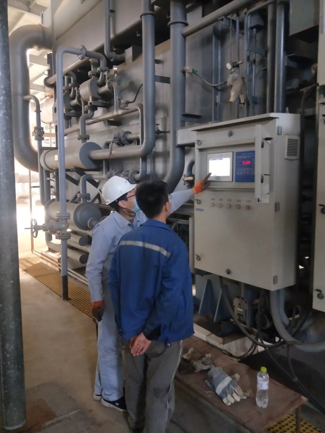 机组于10月23日正式调试,调试工作由赵丰收、胡宗洋两位服务工程师完成。由于是新建系统,调试过程中经常出现热源水入口、热水入口温度低、蒸汽压力、温度控制不稳定等异常情况,赵丰收和胡宗洋两位服务工程师在现场连续2天昼夜加班,机组才正常调试完成。