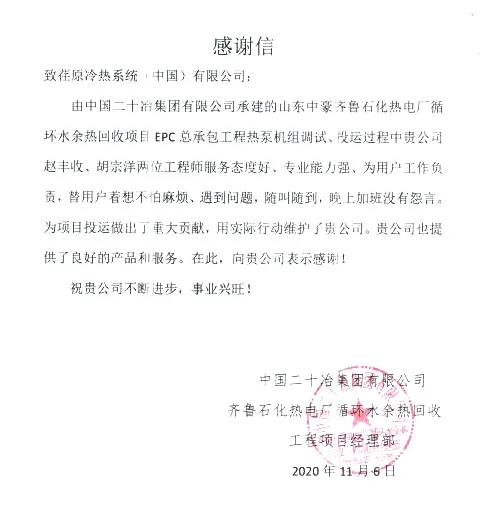 我们的努力付出,也得到了客户的信任与感动,机组投运稳定后,客户给我们发来了感谢信。