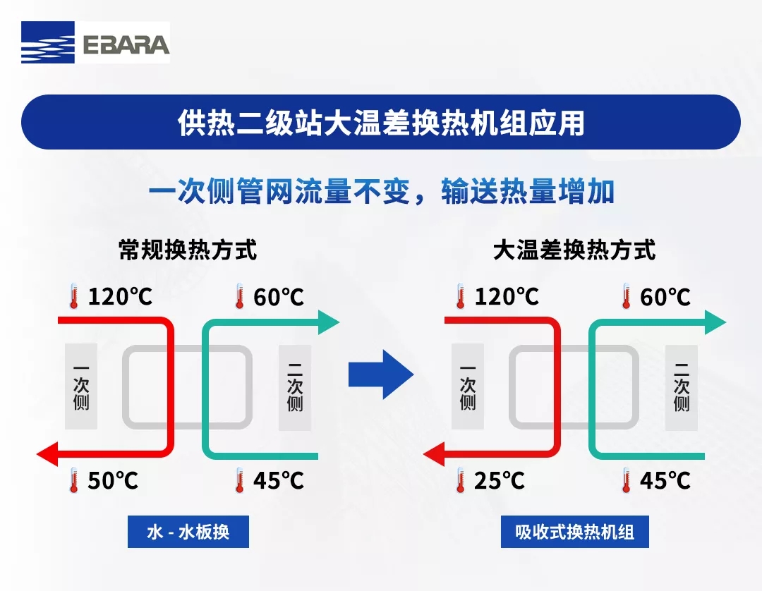 该项目中吸收式大温差换热机组替代原有的板式换热器,可以将一次热网回水温度降低到20℃,拉大供回水温差,把热量最大限度传递到二次热网,大幅提高管道输热能力,可增大供热面积35%。二次网送出50℃和60℃等不同温度的热水,满足地暖、壁挂暖气供热要求,保证供暖效果。
