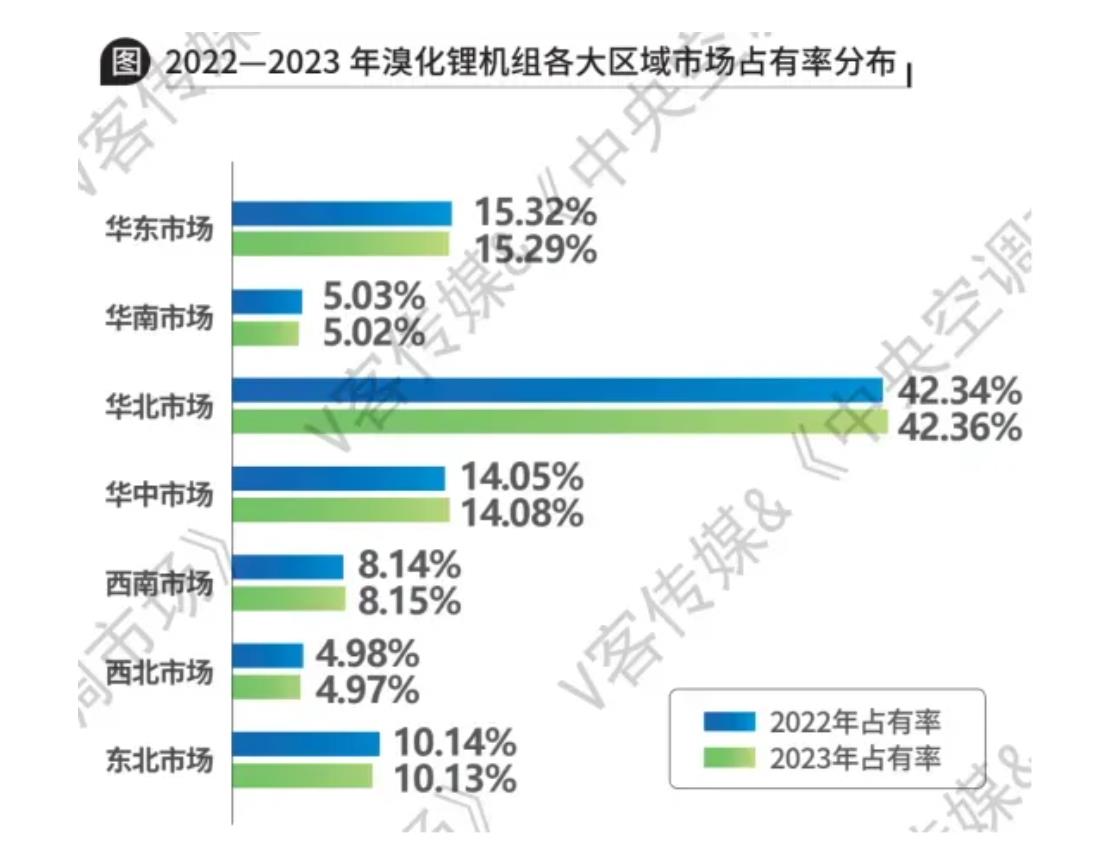作为中央空调行业内的低碳节能典型代表,溴化锂机组具有无污染、节电等优势,在工业余热利用领域应用广泛。据V客传媒统计,2023年,在市场需求变化以及离心式热泵产品加速推广等多重因素的影响下,溴化锂市场整体规模较去年下滑2.33%。