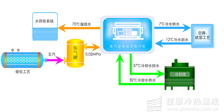 荏原公司与轮胎企业的合作开发了硫化蒸汽回收装置,经实测回收的蒸汽压力约为0.02MPa,可作为荏原低压蒸汽型吸收式制冷机的驱动热源,利用回收的余热制取低温冷水满足工艺用冷需求。可取代电制冷机组,节约电耗,几乎不产生运行费用,并解决了轮胎厂“冒白气”的问题。经济效益与环境效益显著,在橡胶轮胎行业迅速得到了推广。