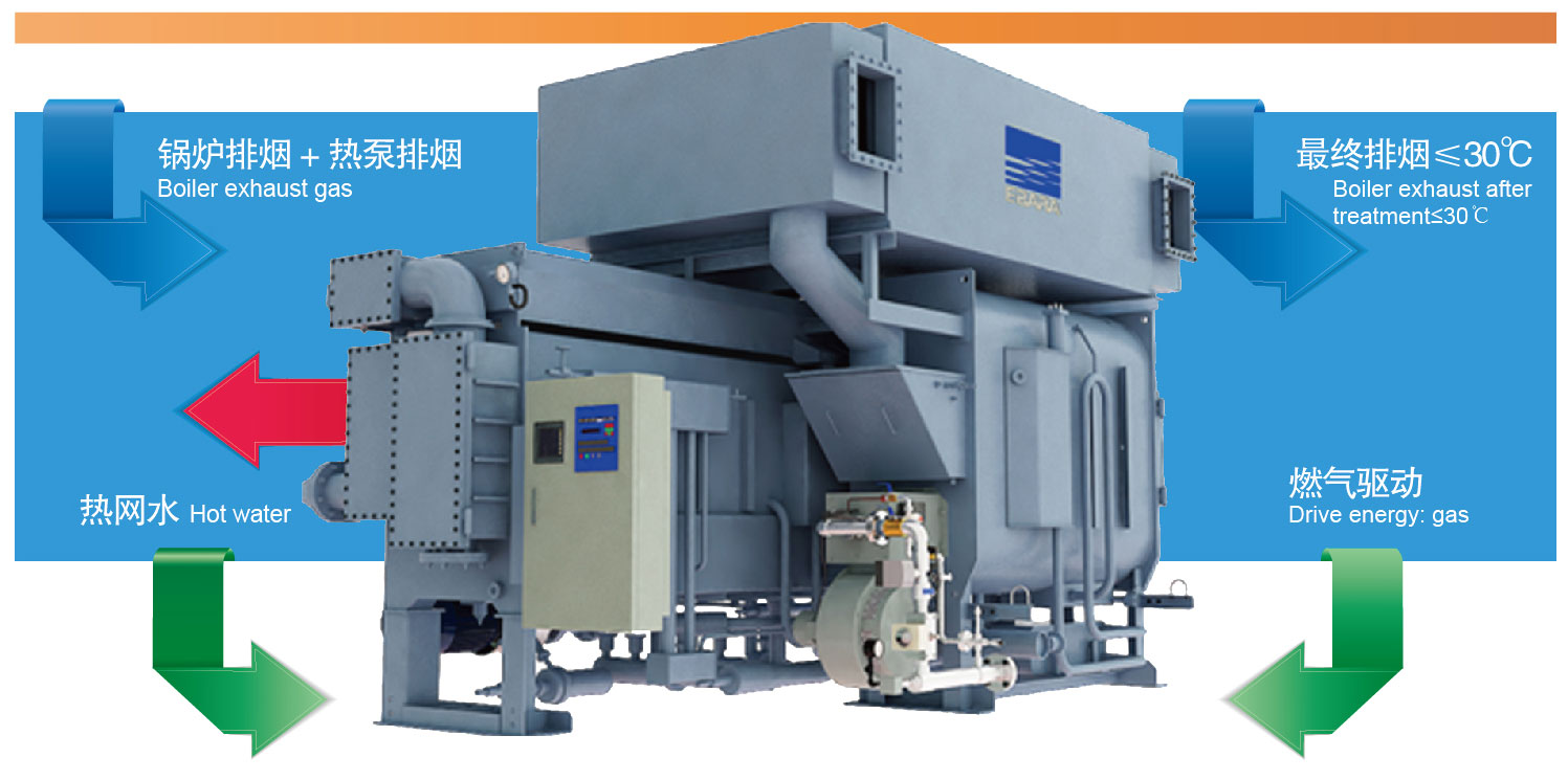 燃气锅炉供热站采用烟气全热回收型热泵一体机,深度回收锅炉排烟中的显热和水蒸气潜热,用于加热热网水,可以将锅炉排烟温度降至30℃以下,有效提高锅炉效率,节省天然气耗量11%-13%,同时可以直接净化锅炉排烟,减少PM2.5雾霆主要形成物的排放。