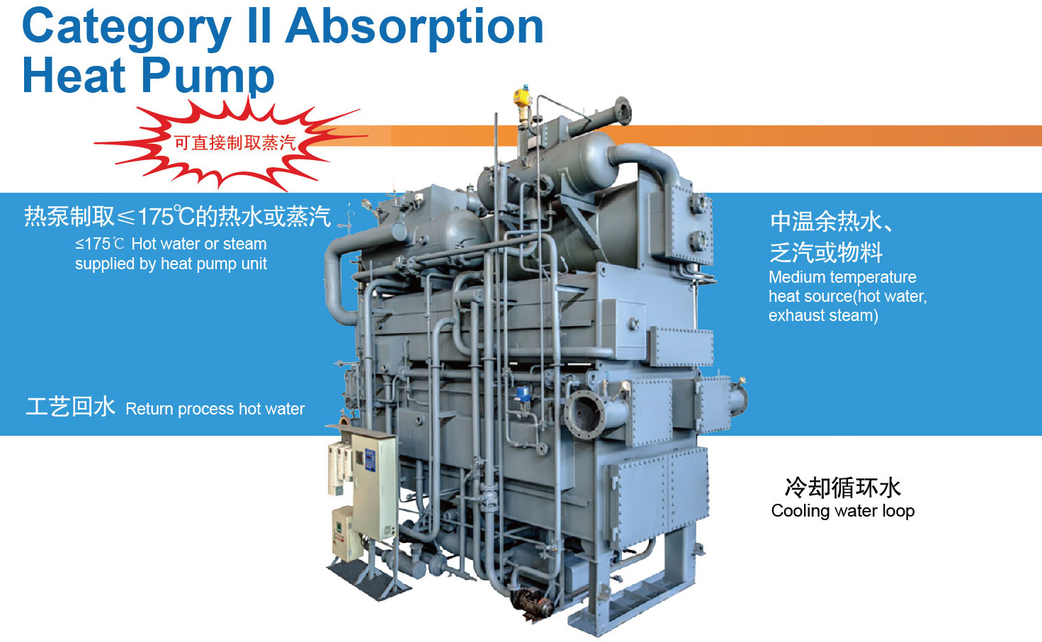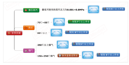 第二类吸收式热泵主要应用于工业生产工艺领域,无需高温热源驱动,仅在冷却水的作用下,便可直接回收中温余热源中的热量,将其转化为生产工艺所需的高温热源(不超过1750C的热水或蒸汽),节能减排效果显著。