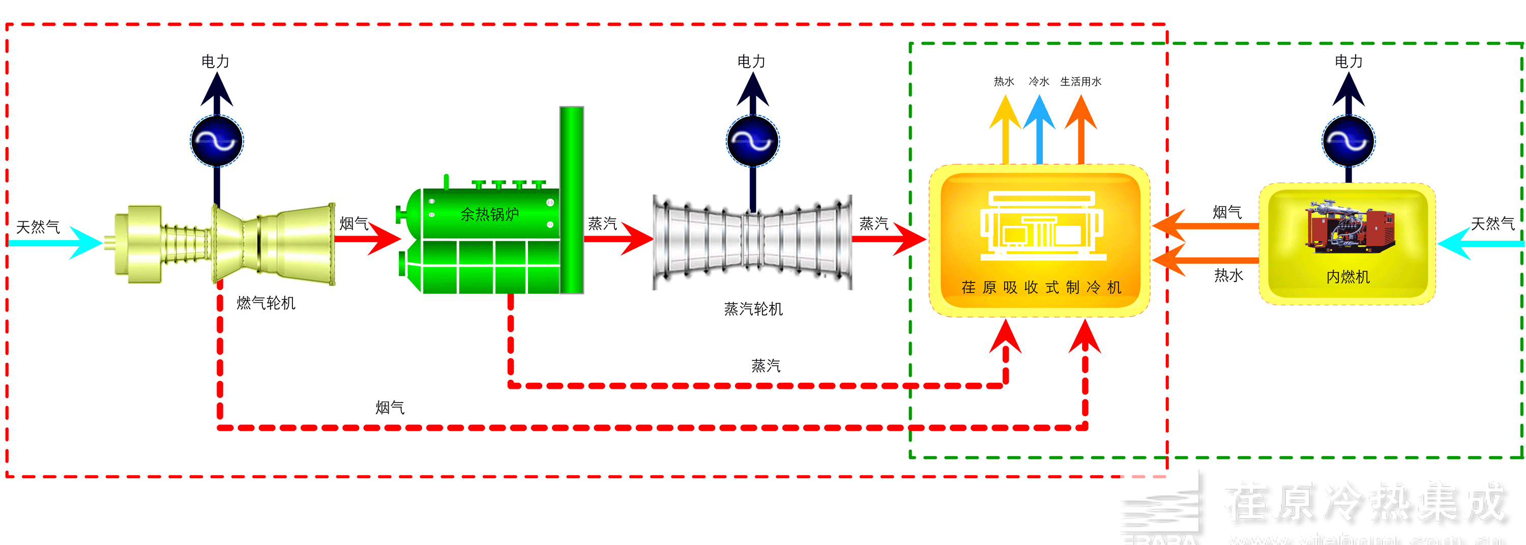 一、烟台荏原在分布式能源典型应用 1.内燃机发电 在以内燃机为发电机组的热电冷联供系统中,内燃机排放的余热有发电机排烟和缸套水,在系统中可配置烟气热水型或烟气热水补燃型等溴冷机来利用这部分余热进行制冷