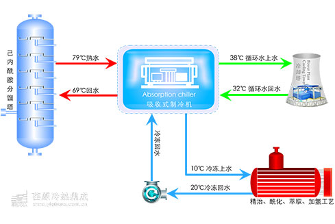 1、系统设计该公司一期5万吨/年己内酰胺项目上,采用蒸汽型吸收式制冷机制取低温冷水提供萃取等工艺用冷,己内酰胺分馏装置产生的高温水没有得到有效利用,通过空冷器进行降温循环使用,耗电巨大;蒸汽价格较高(内部结算价为80元/吨),采用蒸汽型吸收式制冷机也会产生较高的运行费用。因此